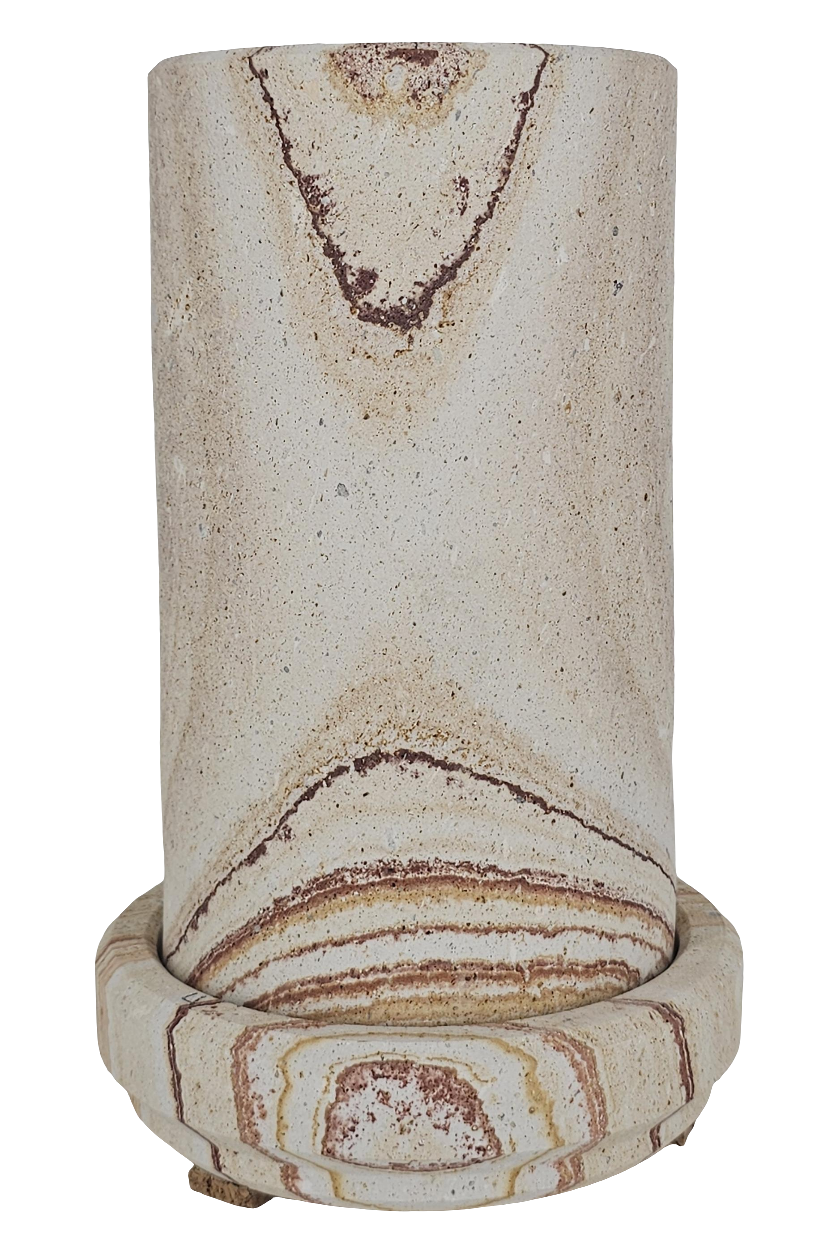 Dieser Coolkeeper besteht zur Gänze aus Sandstein. Seine Besonderheit ist der Roteinschlag in vertikalem Verlauf, der auf seltene Eisensulfitrückstände zurückzuführen ist.