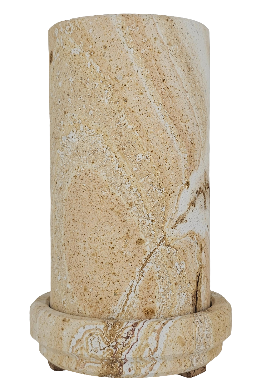 Dieser Coolkeeper besteht zur Gänze aus Sandstein. Seine Besonderheit ist der Roteinschlag in vertikalem Verlauf, der auf seltene Eisensulfitrückstände zurückzuführen ist.