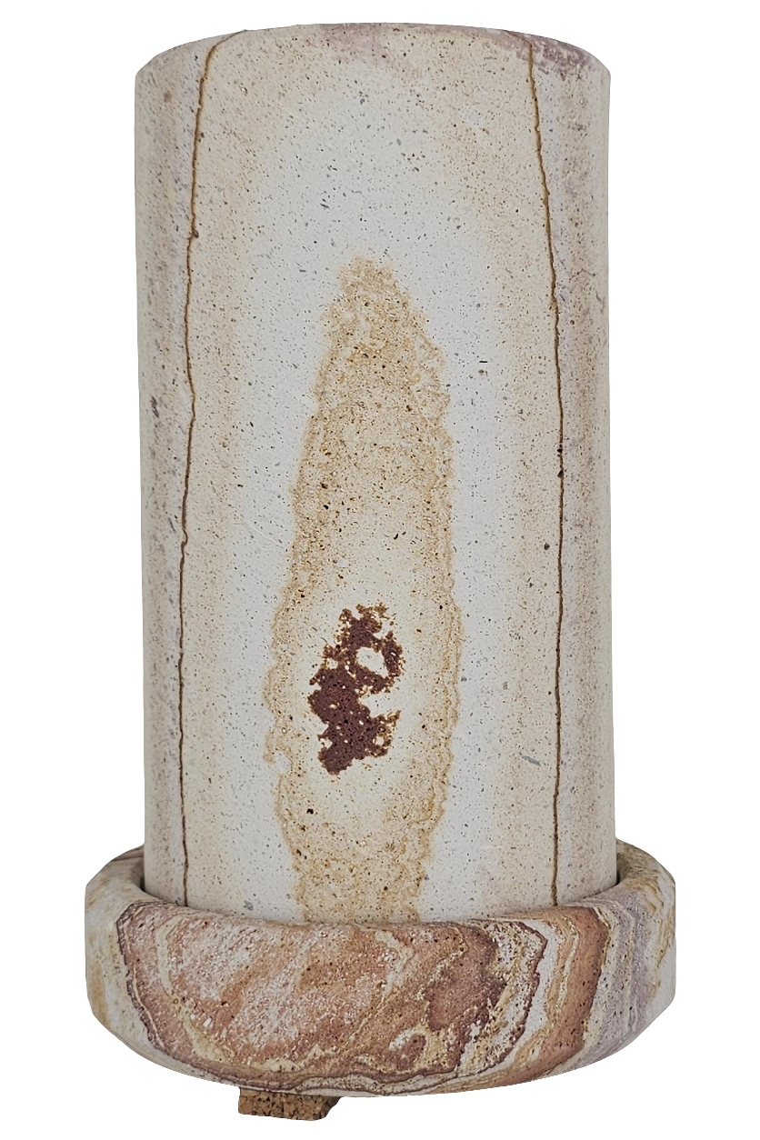 Dieser Coolkeeper besteht zur Gänze aus Sandstein. Seine Besonderheit ist der Roteinschlag in vertikalem Verlauf, der auf seltene Eisensulfitrückstände zurückzuführen ist.