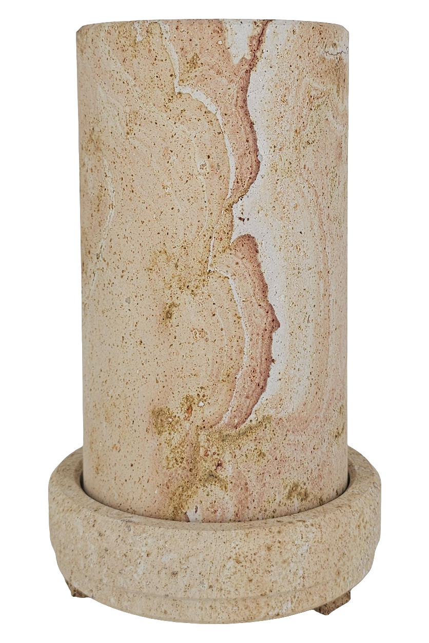 Dieser Coolkeeper besteht zur Gänze aus Sandstein. Seine Besonderheit ist der Roteinschlag in vertikalem Verlauf, der auf seltene Eisensulfitrückstände zurückzuführen ist.