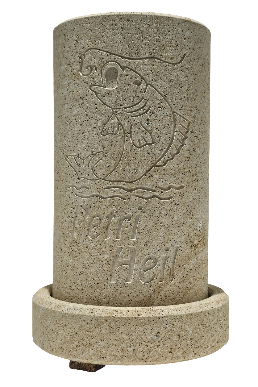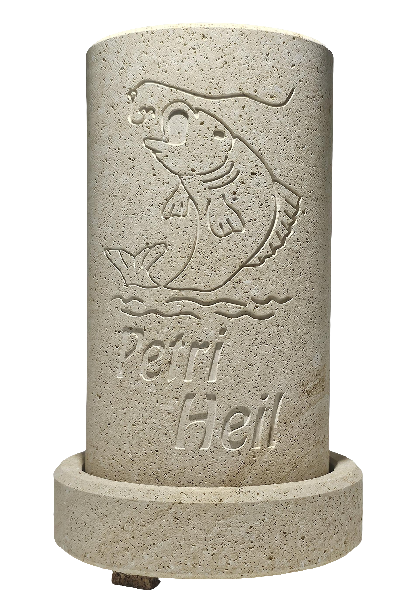 Dieser stilvolle Weinkühler aus hochwertigem Sandstein ist das perfekte Accessoire für Angler und Naturfreunde. Mit der individuellen Gravur „Petri Heil“ und dem kunstvoll eingravierten Fischmotiv wird er zu einem ganz besonderen Hingucker.